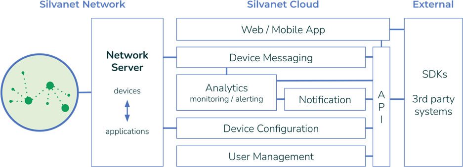The Silvanet Cloud captures data served by the Silvanet Mesh Network and received from the Silvanet Sensor devices. It provides a web application for end-users of the Silvanet System, enabling them to manage and view the sensors and gateways of their deployment, to view and analyze sensor data and to configure alerts.