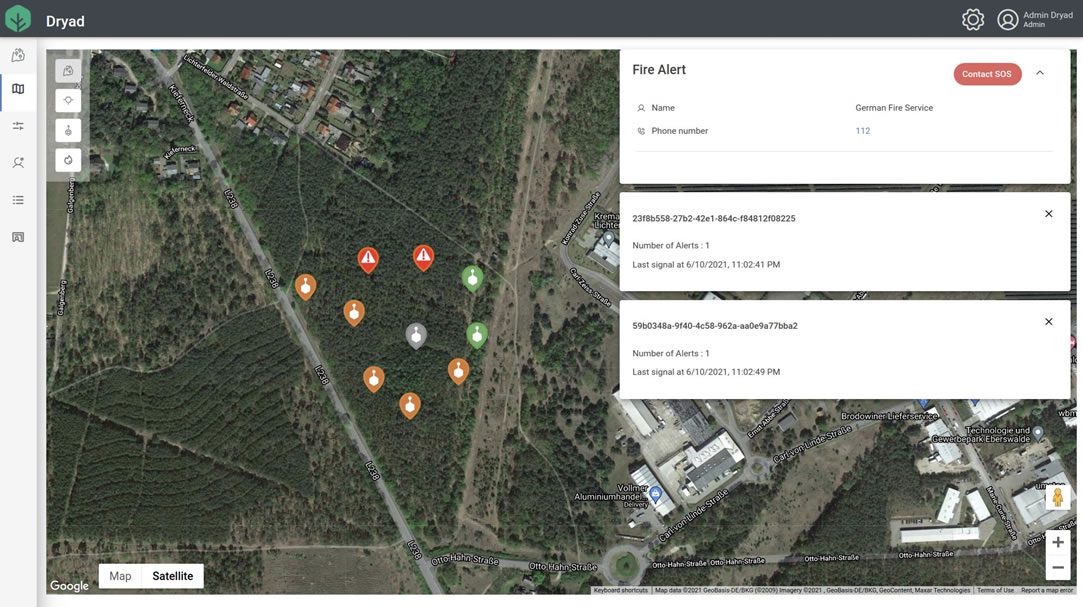 The fire alert is clearly shown on the cloud platform highlighting the interested sensors and their position on the map but also an SMS and an e-mail notification are sent to end users.